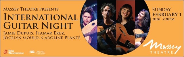 A banner ad for International Guitar Night at Massey Theatre